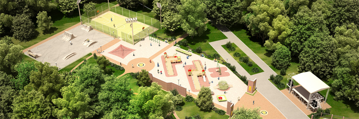 По проекту парк разделен на две зоны. В основной зоне на входе в парк установлено специальное оборудование для детей с ограниченными возможностями. Спортивная площадка с универсальным полем для занятия игровыми видами спорта расположена во второй зоне парка.